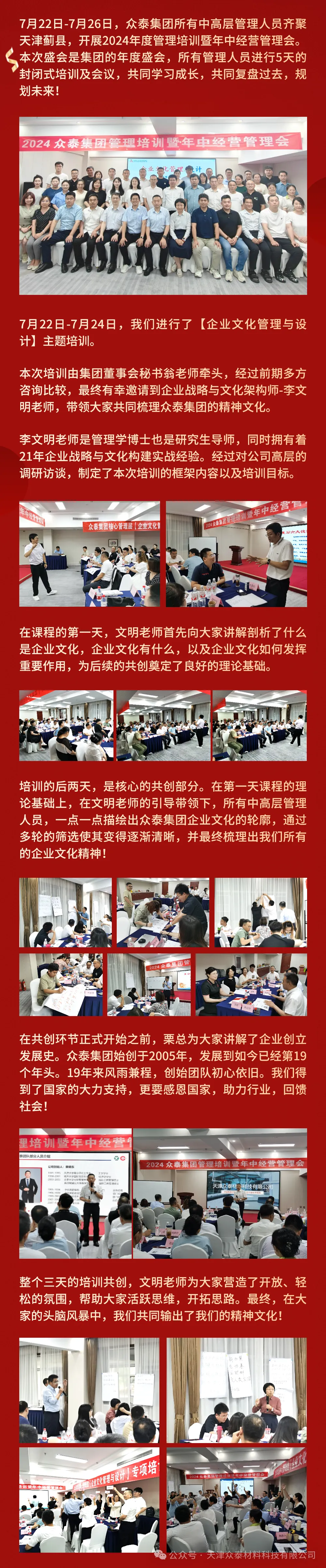 7月22日-7月26日,眾泰集團所有中高層管理人員齊聚天津薊縣,開展2024年度管理培訓暨年中經(jīng)營管理會。本次盛會是集團的年度盛會,所有管理人員進行5天的封閉式培訓及會議,共同學習成長,共同復盤過去,規(guī)劃未來!