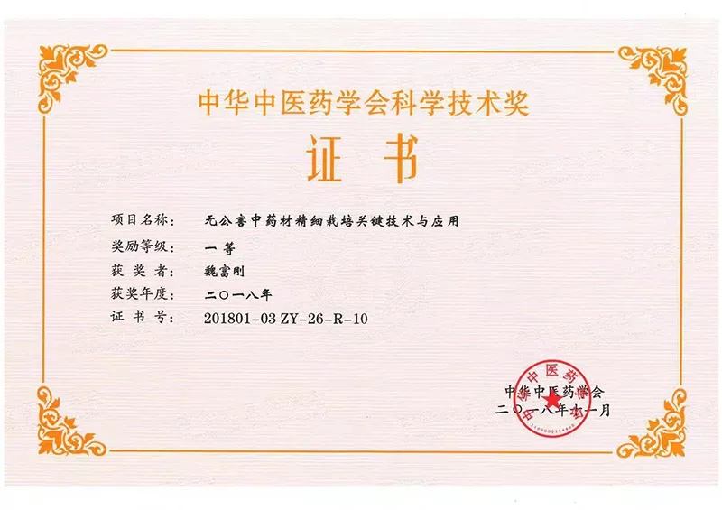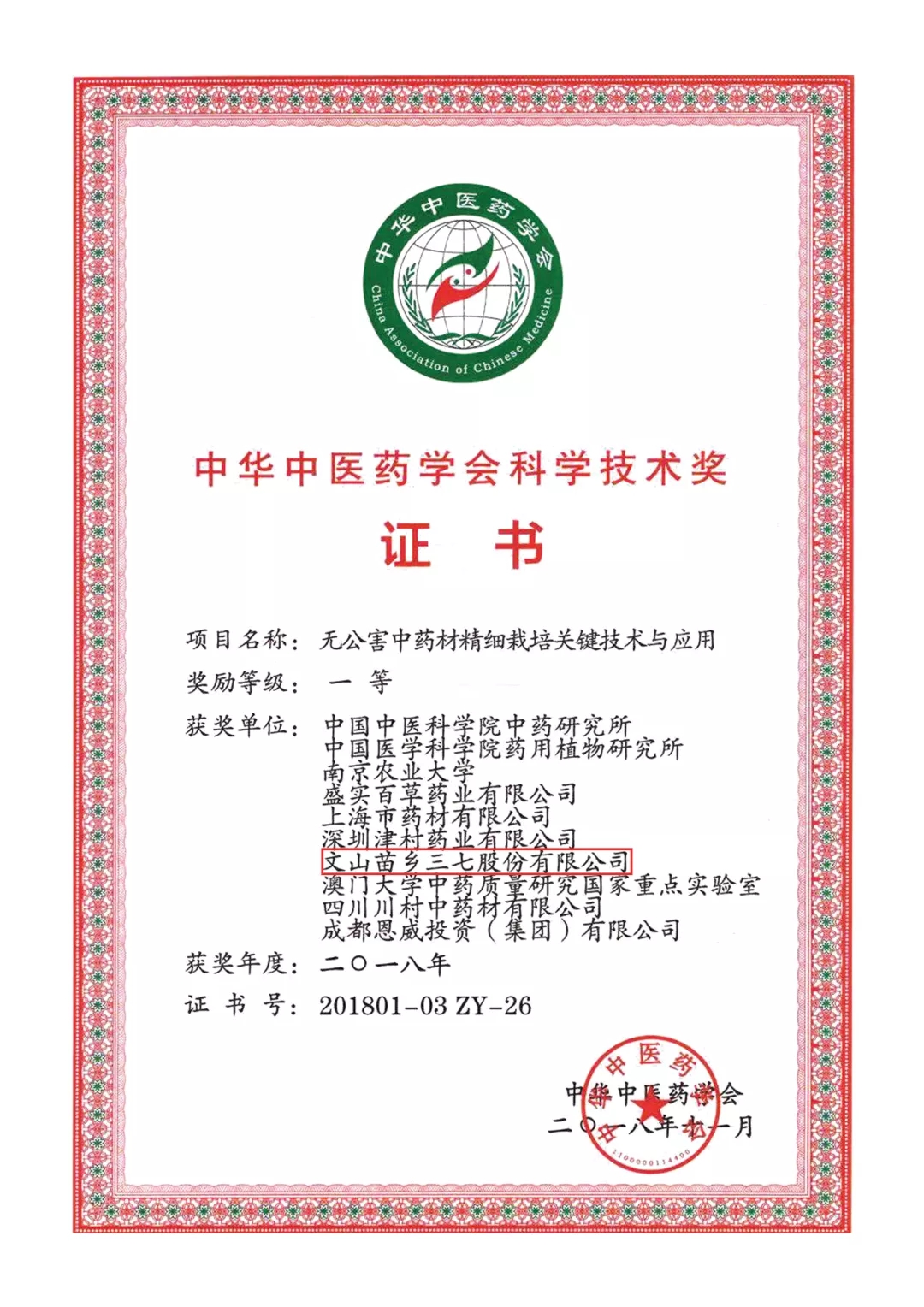 ? ? ? 2018年11月25日,苗鄉(xiāng)三七與中國中醫(yī)科學(xué)院中藥研究所等單位共同開展的“無公害中藥材精細栽培關(guān)鍵技術(shù)與應(yīng)用”項目榮獲中華中醫(yī)藥學(xué)會科學(xué)技術(shù)一等獎,苗鄉(xiāng)三七科技公司總經(jīng)理魏富剛獲個人一等獎。