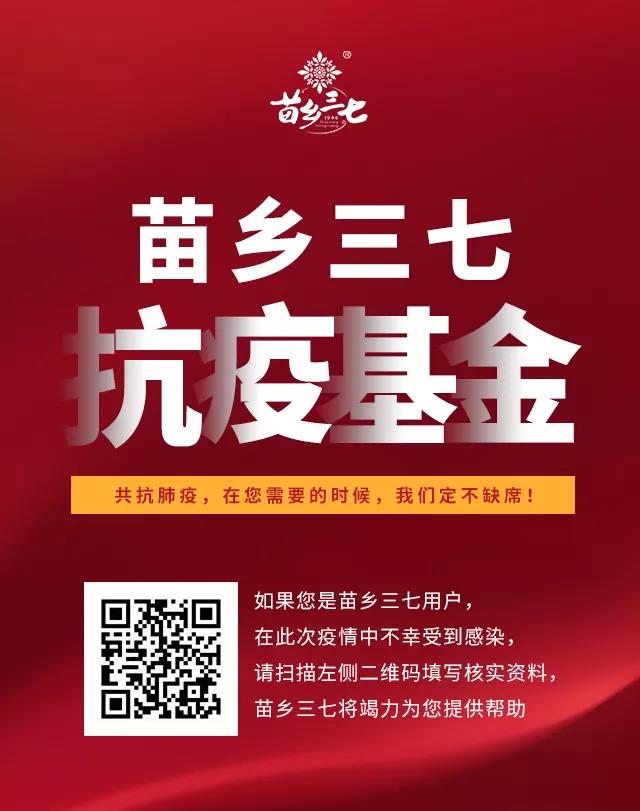 向防治疫情前線捐贈價值87萬元三七產(chǎn)品的同時,苗鄉(xiāng)三七成立150萬元抗疫基金,將為此次疫情中不幸感染的苗鄉(xiāng)三七用戶提供專項(xiàng)幫助!